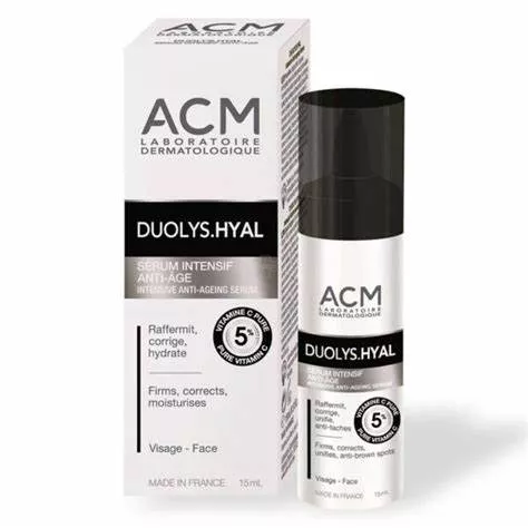ACM Duolys Hyal sérum 5 % a été formulé afin de prévenir et de corriger visiblement les signes du vieillissement cutané (rides, ridules et taches brunes). Le sérum associe de hautes doses de vitamine C pure (acide ascorbique) associé à de la vitamine E, B5 et de l’acide hyaluronique. La vitamine C, dosée à 5%, permet de bloquer les radicaux libres, de renforcer la production de collagène et de réveiller l’éclat du teint.