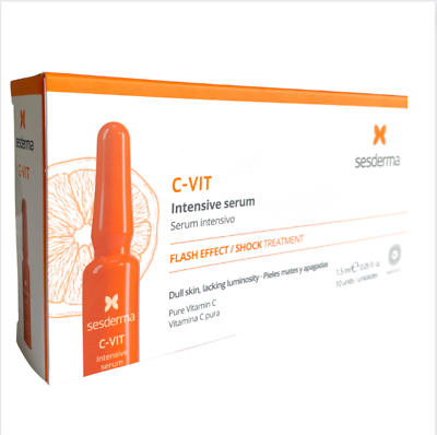 Sesderma C-Vit Intensive Serum Ampoules est un soin flash pour les peaux ternes et fatiguées. Contenant 12 % de vitamine C pure, dans une formule sans eau pour augmenter la stabilité, il possède de puissantes propriétés antioxydantes et booste instantanément la luminosité de la peau. Adaptées à tous les types de peau, ces ampoules remplacent le sérum habituel pour un teint instantanément plus lumineux et plus éclatant. Ils sont parfaits pour un événement important ou une occasion spéciale. Ayant un effet flash, elles vous procureront immédiatement un bel éclat naturel. Si vous connaissiez déjà ces ampoules, vous remarquerez peut-être quelques différences. Maintenant emballés dans une belle ampoule en plastique orange, au lieu de verre, ils sont plus sûrs et recyclables. De plus, comme cette formule puissante n’est stable que pendant 24h et que 2 ml étaient excessifs pour une journée d’utilisation, elles contiennent désormais 1,5 ml de produit. Mais ne vous inquiétez pas, au lieu de 5 ampoules, cette nouvelle boîte en contient 10 !