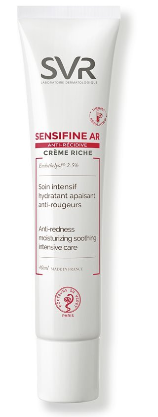 Pour les peaux sujettes aux rougeurs et les sensibles à tendance couperosique, le laboratoire SVR crée Sensifine AR soin anti-rougeurs thermorégulateur anti-récidive. Véritable effet « coupe-feu », il calme instantanément et durablement sensations d’échauffements et rougeurs et prévient leur réapparition. Hautement concentrée en extrait de réglisse et en Endothelyol, Sensifine AR Crème apaise, décongestionne et abaisse la température de la peau. Ce soin gel-crème procure une fraîcheur apaisante immédiate. Sa texture gel-crème frais aux cristaux liquides fond rapidement sur la peau, pour une hydratation longue durée. Des pigments verts neutralisent optiquement les rougeurs.